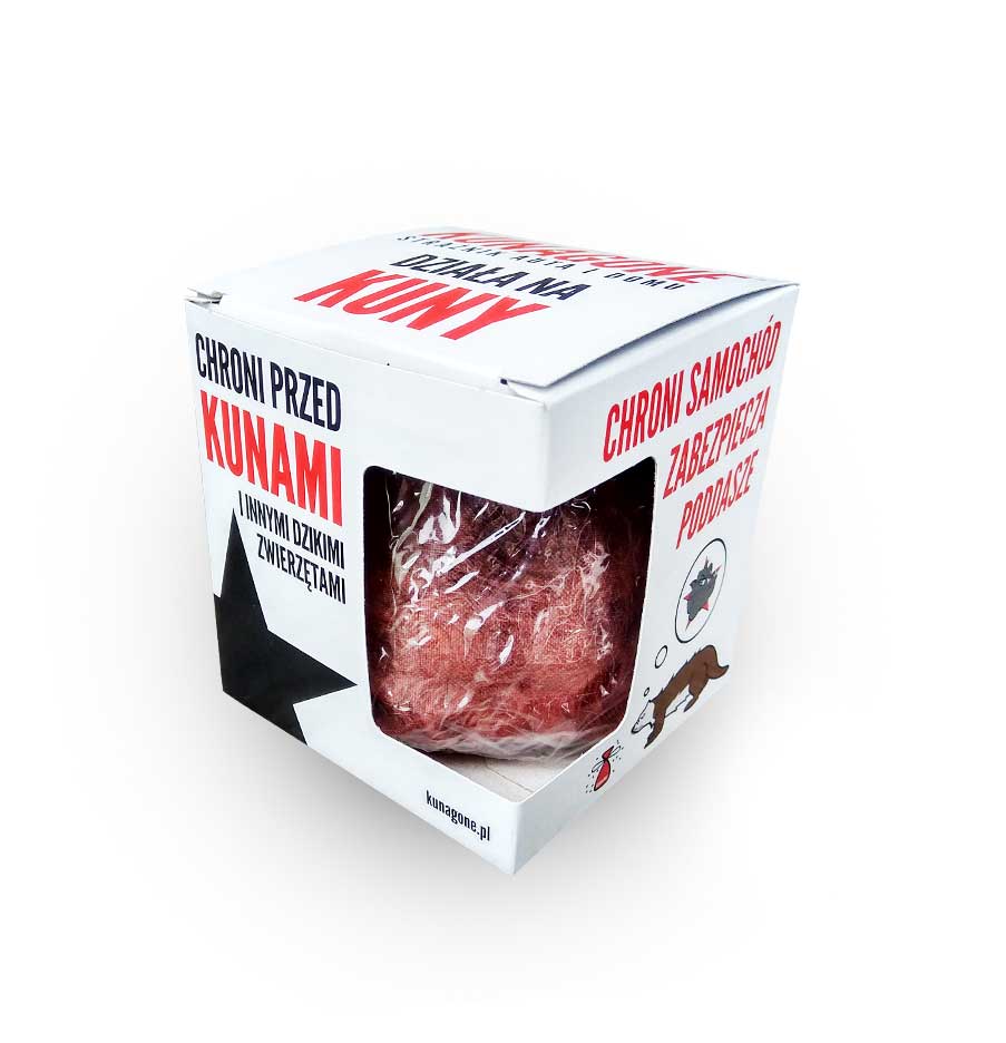Kunagone to naturalny odstraszacz na kuny do samochodu i gospodarstwa domowego. W jaki sposób działa i co go wyróżnia?   Kunagone wyzwala zapach psa, co działa odstraszająco na dzikie zwierzęta, w tym kuny. Dzięki temu można uniknąć dużych i kłopotliwych szkód. Zaliczyć do nich można między innymi pogryzione kable elektryczne pod maską samochodu, szkody na poddaszu lub stratę zwierząt hodowlanych (np. kur).